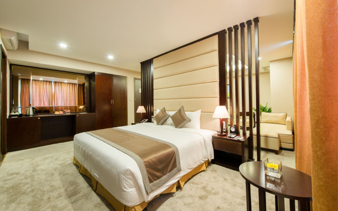 Phòng cao cấp nhất của khách sạn, có phòng khách riêng biệt, bồn tắm lớn, và view trung tâm thành phố.