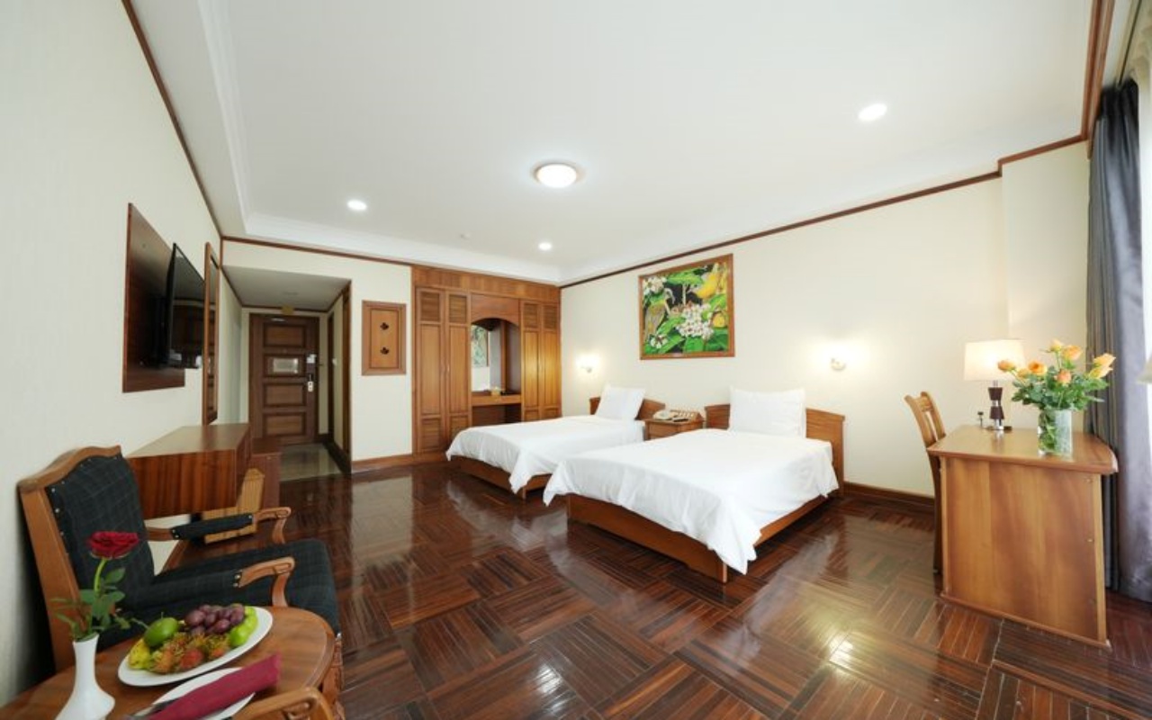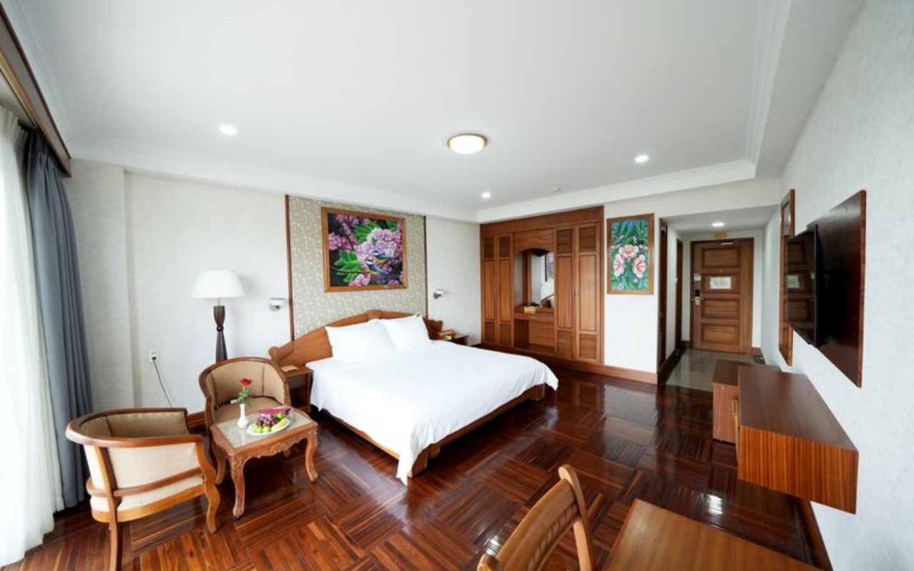 👉 Phòng được trang bị đầy đủ: giường cao cấp, TV, điều hòa, minibar, bàn làm việc, phòng tắm riêng, wifi tốc độ cao – đáp ứng tốt nhu cầu nghỉ dưỡng và làm việc.