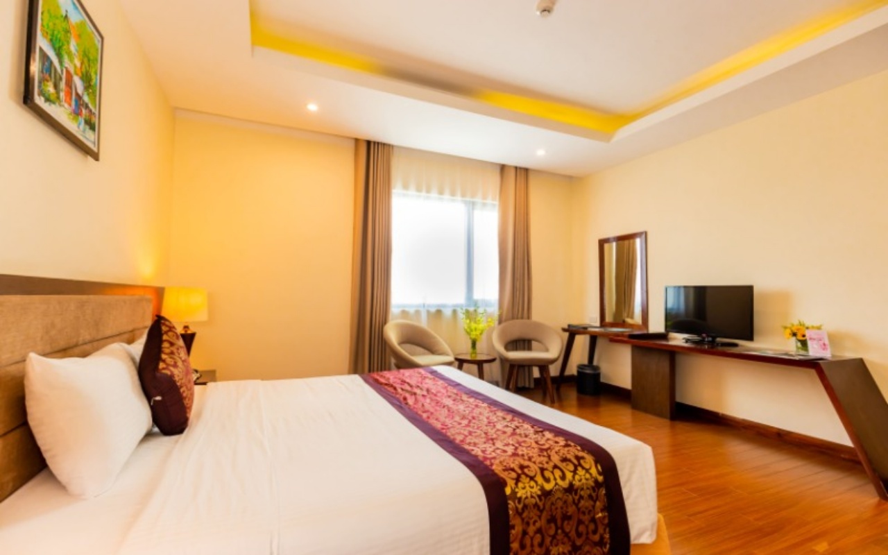 Trang bị 1 giường đôi, sàn gỗ, phòng tắm đứng hiện đại, view hướng thành phố Đồng Hới. Phù hợp cho cặp đôi hoặc khách công tác.