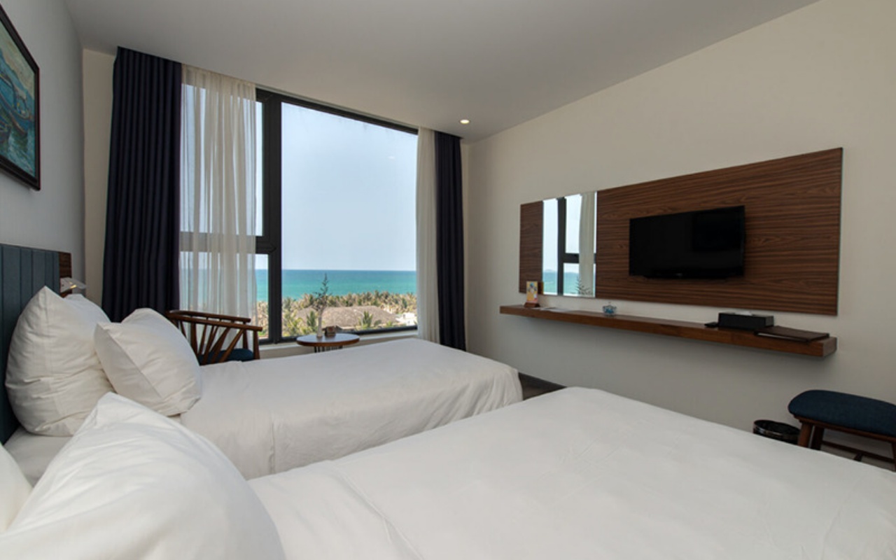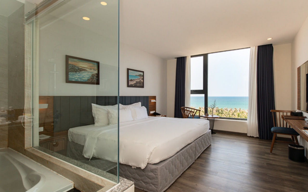 Cửa sổ lớn hướng ra biển xanh, nơi bạn có thể ngắm bình minh mà không cần rời khỏi giường. Phòng gọn gàng, tiện nghi – thích hợp cho du khách công tác hoặc du lịch ngắn ngày.