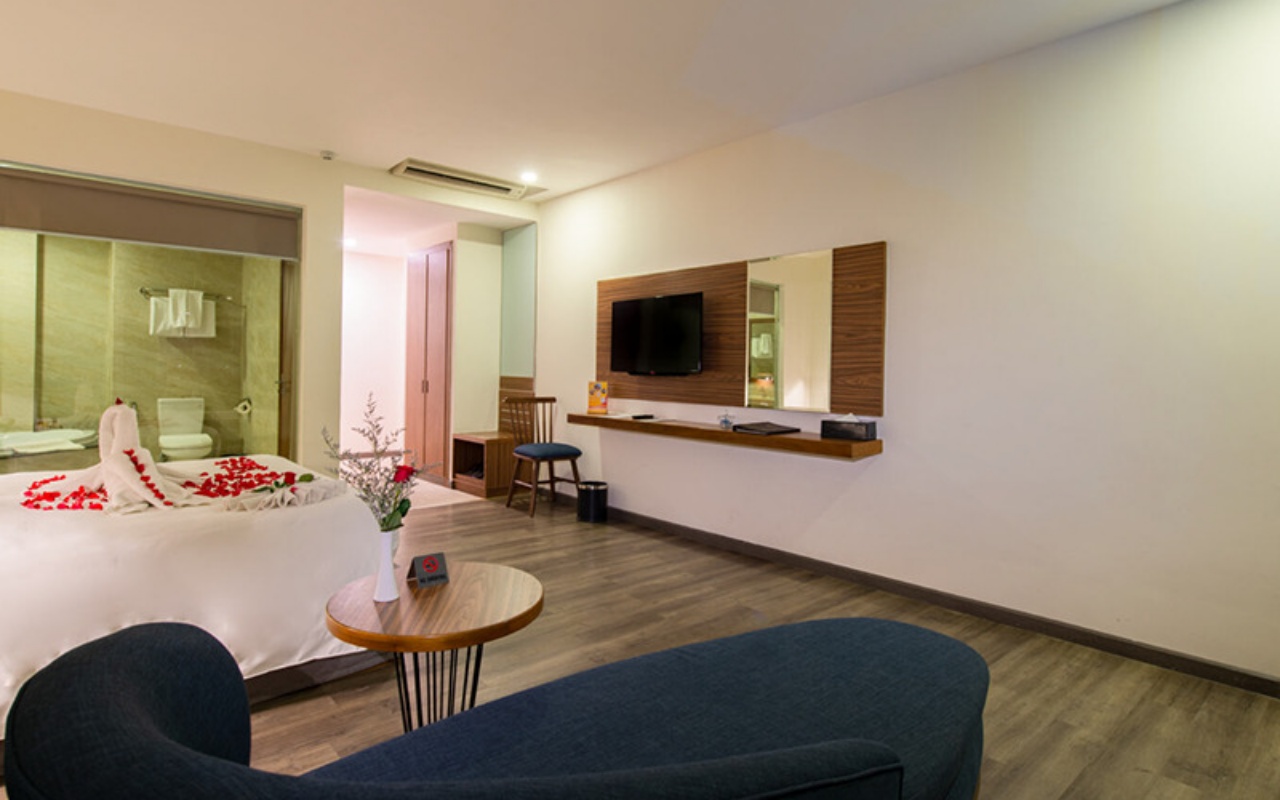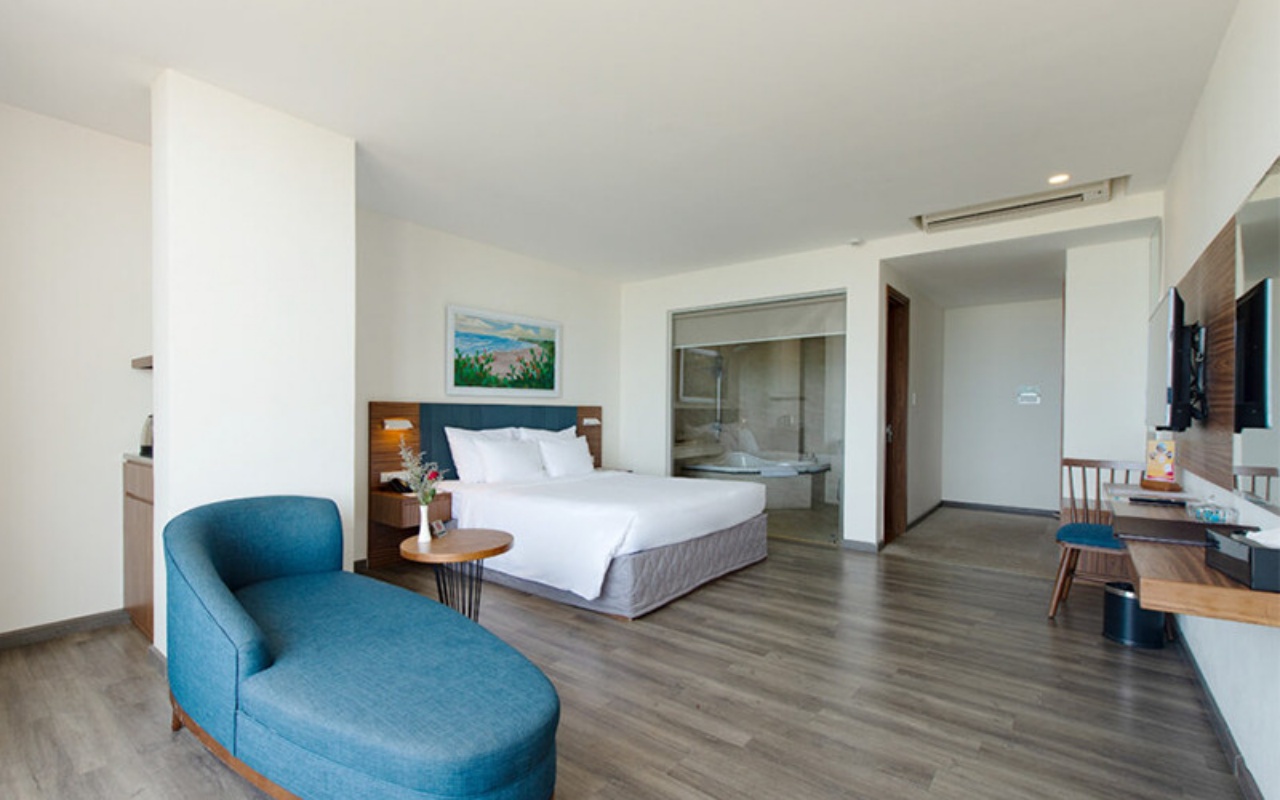 Phòng sang trọng với sofa thư giãn và bồn tắm nằm, view thẳng biển Tuy Hòa. Mọi thứ được sắp đặt tinh tế để mang đến trải nghiệm nghỉ dưỡng cao cấp nhất cho cặp đôi.