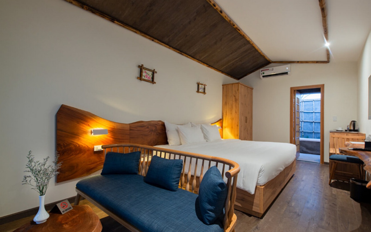 Hạng phòng đặc biệt với bồn tắm ngoài trời, nơi bạn có thể đắm mình giữa tiếng gió và mùi hoa cỏ. Từng chi tiết đều mang cảm hứng thiên nhiên, dành cho cặp đôi muốn tận hưởng khoảnh khắc lãng mạn.