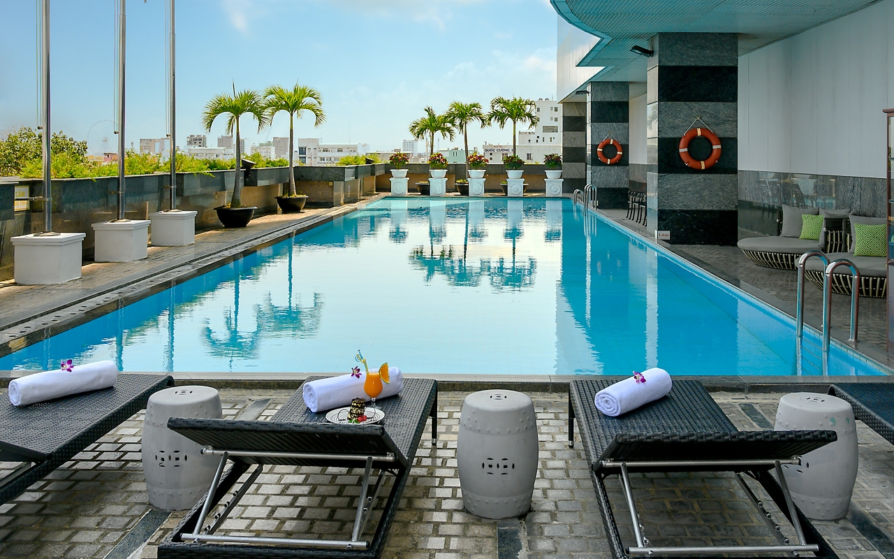 Hồ bơi ngoài trời rộng khoảng 100m², không gian thoáng đãng với tầm nhìn đẹp. Du khách có thể vừa thư giãn vừa thưởng thức đồ uống tại khu vực hồ bơi.
